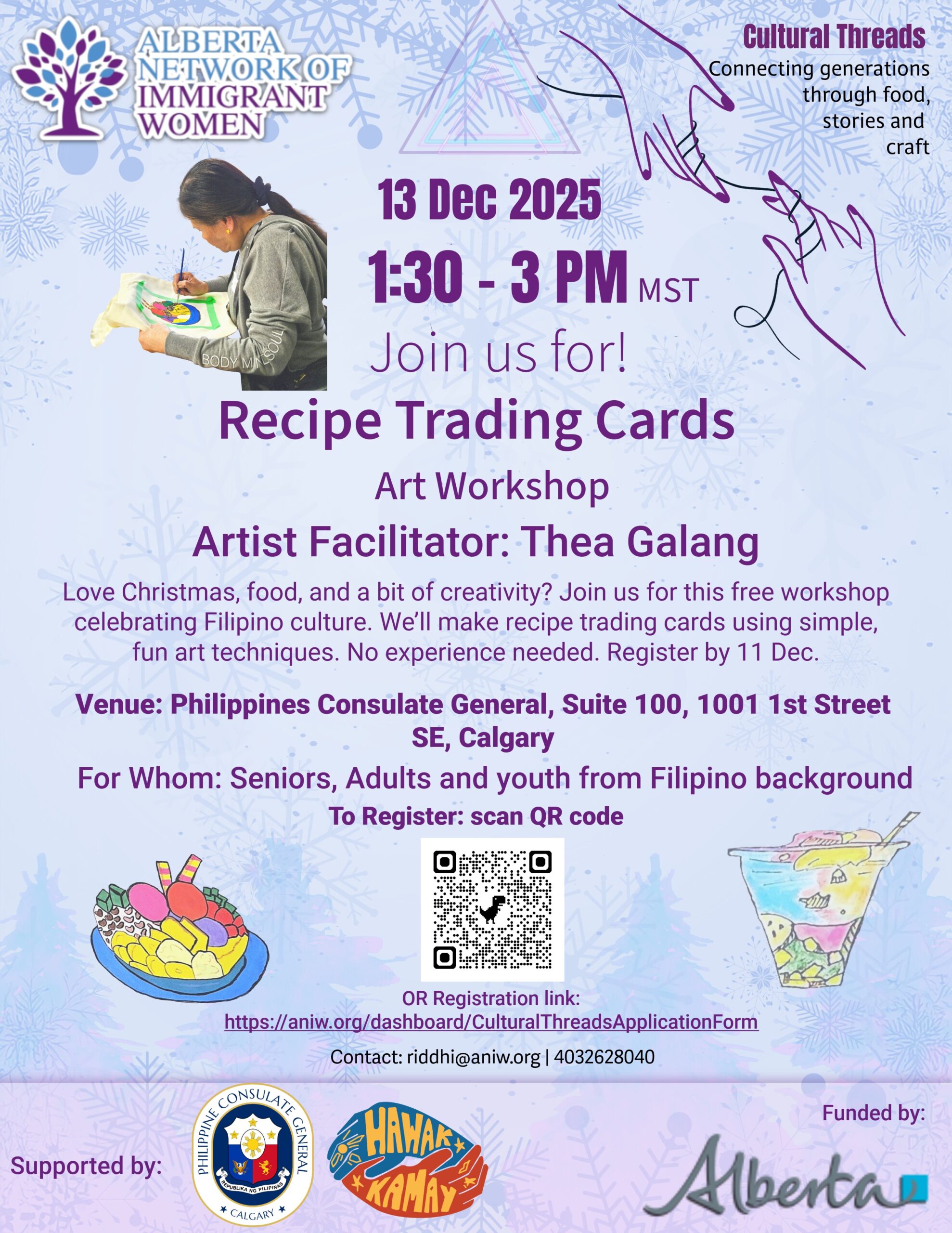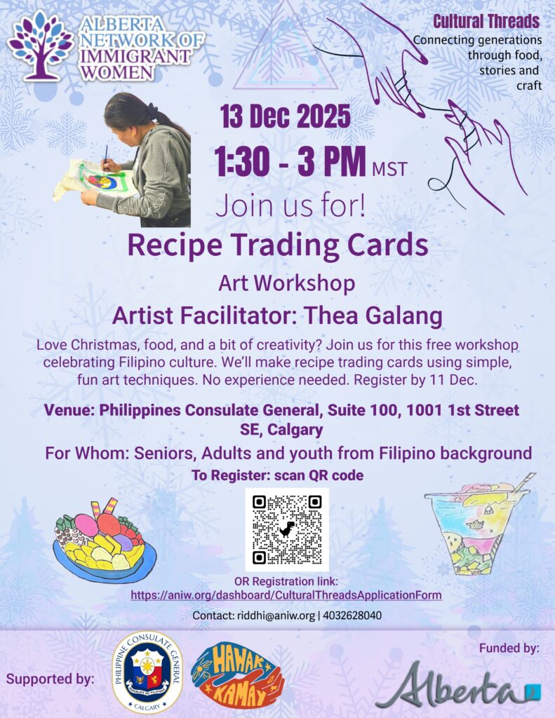Get into the holiday spirit with creativity, culture, and community! Christmas is around the corner, and we’re bringing festive joy to Calgary’s Filipino community with a unique Recipe Trading Cards Art Workshop! Join us on 13 December 2025 at the Philippines Consulate General in Calgary for an afternoon of art-making, storytelling, and shared food memories. Guided by artist facilitator Thea Galang, participants will create beautifully illustrated recipe trading cards inspired by beloved Filipino dishes and family traditions. Whether you’re excited for the holidays, craving a creative break, or simply want to reconnect with flavours and stories from home, this workshop is the perfect space to relax, make art, laugh together, and celebrate what food means to us.