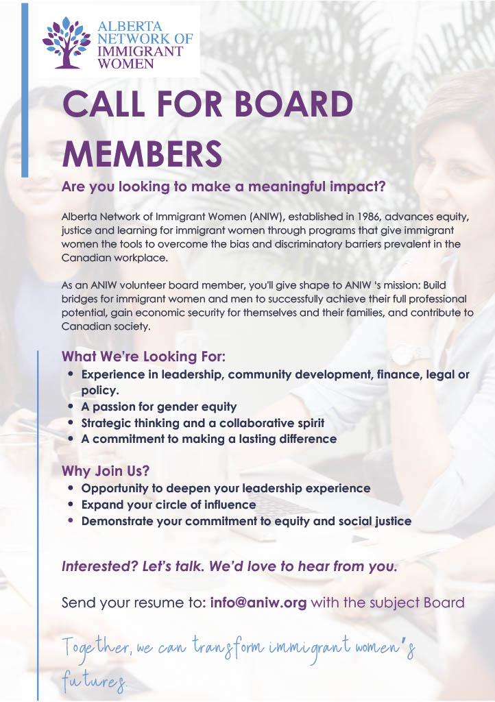 “ANIW is looking for volunteer board members from across Alberta to join our team.If you’re interested or know someone who would be a great fit, please send us your resume : info@aniw.orgWe would love to connect!”